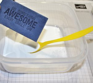 Nun stempelst Du Deinen Spruch mit VersaMark (durchsichtiger/klebriger Tinte) auf den Farbkarton. Der Stempel kann im Anschluss ganz normal in der „Schrubbkiste“ oder unter Wasser gereinigt werden (gleicher Umgang wie mit allen anderen Stempelfarben auch).