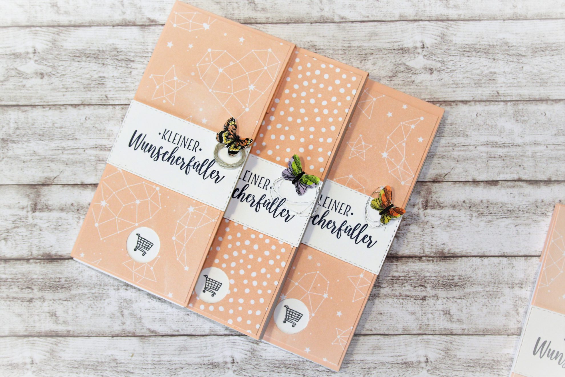 Der kleine Schmetterling ist mit der Handstanze, die es passend zum Stampelset Schmetterlingsglück gibt – aus dem dazugehörigen Designerpapier augestanzt. Länge und Breite des Designerpapieres für die Dekoration kannst Du je nach Maß des Zettelblocks beliebig anpassen.