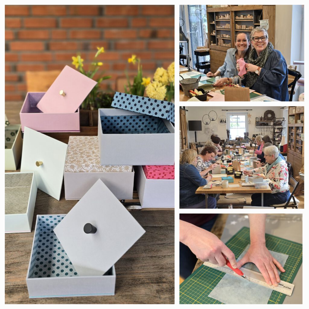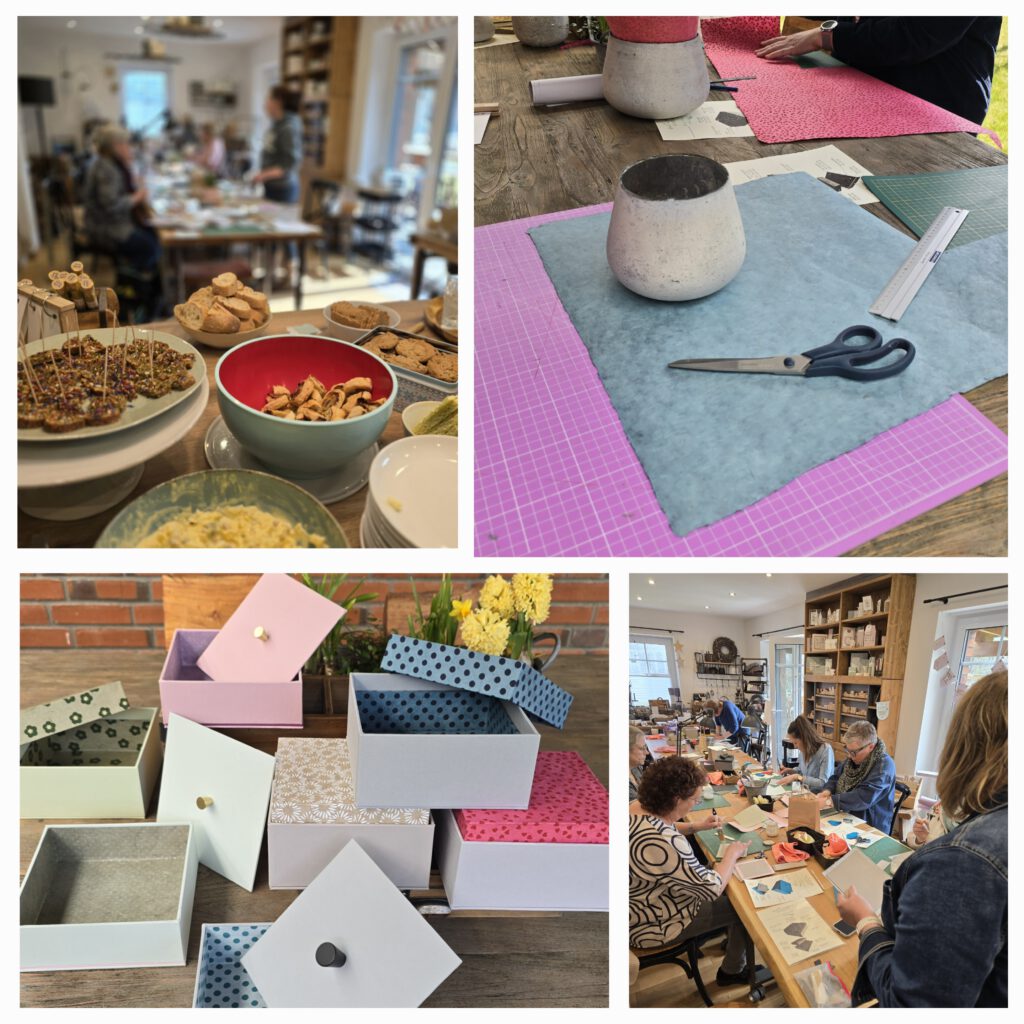 Im Vorfeld wurde ich gefragt, was denn eigentlich ein Schachtelbau-Workshop ist? Letztlich ist es das Gestalten einer individuellen Box, die aus Graupappe, Buchleinen und Nepal- oder Designpapieren erstellt wird. Der Schachtelbau gehört in die Kategorie der Buchbinderei.